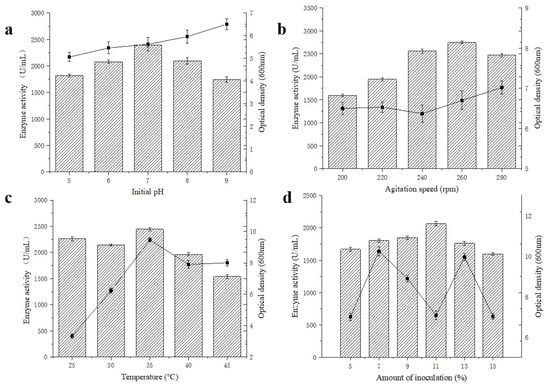 The optimized medium was adjusted at different initial pH levels (5.0, 6.0, 7.0, 8.0, 9.0), stirring speeds (200, 220, 240, 260, 280 rpm), temperatures (25, 30, 35, 40, 45 °C), and inoculation concentrations (5%, 7%, 9%, 11%, 13%, 15%). All the values of enzyme activities were averaged from three replicates with standard deviations.