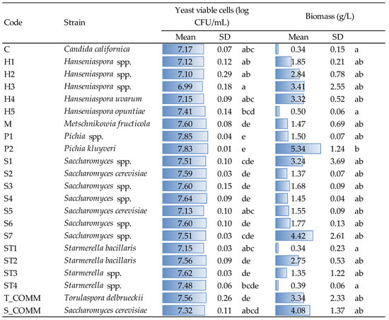 Concerning viable cells, statistical elaboration allowed us to highlight significant differences inter- and intra-specie. For instance, the two Pichia strains (P1 and P2) showed significantly higher values than those found for Candida, Hanseniaspora and commercial S. cerevisiae (S_COMM), as well as, within Hanseniaspora itself, the strain H5 significantly differed from strain H3, which showed the lowest average viability (6.99 log CFU/mL). Despite these variations appearing statistically relevant, from a practical point of view, the number of viable cells detected after growth was comparable for all strains, highlighting a good growing capacity in the tested conditions.