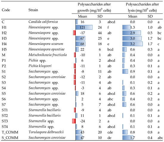 The aptitude of Hanseniaspora spp. to release polysaccharides was confirmed also after β-glucanase treatment (Figure 2). The best results were observed for strains H2, H3 and H4, followed by the commercial S. cerevisiae, whereas for the remaining yeasts, the amount of PS released was less than 1 mg/109 cells, probably depending on a different cell wall composition and autolytic behavior. On average, the amounts of PS detected after lysis (which correspond to 0–44 mg/L) are less relevant than those released during growth (up to approx. 1600 mg/L for certain strains), confirming previous literature results [28]. Different strains, moreover, did not determine after growth, an enrichment of the PS content of the growing medium, but a decrease in the concentration initially found in the YPD broth (red bars in Figure 2).
