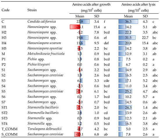 The amounts of amino acids (AA) released by yeast strains after growth and β-glucanase-assisted cell lysis are reported in Figure 3. Concerning the growing phase, different trends were observed, both when comparing the various yeasts, and within the same genus. Saccharomyces spp. appeared to be predominantly a consumer of amino nitrogen during growth and only in a few cases it released small amounts of AA (1.9–6.1 mg/109 cells for strains S2 and S3). Candida californica (strain C) was revealed to be the major producer, with an average concentration after growth of approx. 23 mg/109 cells, followed by the two Hanseniaspora H3 and H4 (with 19.6 and 11.6 mg/109 cells, respectively). Both the commercial ADY, S. cerevisiae and T. delbrueckii, contrary, showed the tendency to consume amino nitrogen (−13.1 and −4.7 mg/109 cells, respectively). Within Hanseniaspora spp., relevant differences were observed also intra-genus: for instance, H3 and H4 significantly differed from the three other strains (H1, H2 and H5) that, in opposition, showed a variable capacity to consume AA, in a range of −1.2 to −24.1 mg /109 cells. Finally, Pichia spp., Metschnikowia spp. and almost all Starmerella strains showed just a minor release of amino nitrogen, with very few significant differences compared to the commercial yeasts used as reference.