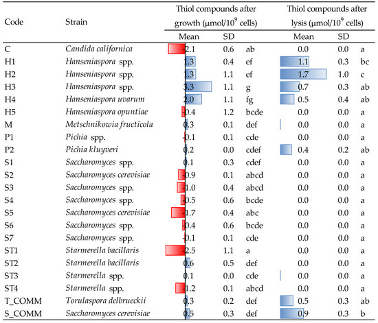 Thiol molecules released by the different strains after growth (48 h, YPD medium, 30 °C) and after lysis induced by β-glucanase enzymes. Data are means and standard deviations (SD) of three repetitions. Different letters mark significant differences according to ANOVA and Tukey HSD test at p < 0.05. T_COMM, S_COMM: commercial active dry yeast preparations. Concerning the values detected after growth, positive and negative values (blue and red bars) indicate, respectively, an increase/production or a decrease/consumption, with respect to the initial composition of the YPD medium.