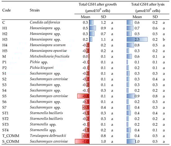 Amount of glutathione released by the different strains after growth (48 h, YPD medium, 30 °C) and after lysis induced by β-glucanase enzymes. Data are means and standard deviations (SD) of three repetitions. Different letters mark significant differences according to ANOVA and Tukey HSD test at p < 0.05. T_COMM, S_COMM: commercial active dry yeast preparations. Concerning the values detected after growth, positive and negative values (blue and red bars) indicate, respectively, an increase/production or a decrease/consumption, with respect to the initial composition of the YPD medium.