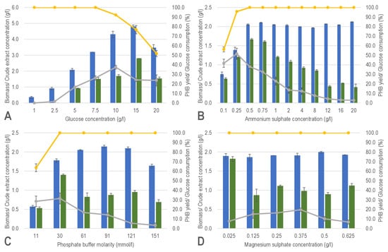 The influence of a selected component of the minimal propagation medium ((A)—glucose concentration (g/L); (B)—ammonium sulfate concentration (g/L); (C)—phosphate buffer molarity (mmol/L) and (D)—magnesium sulfate concentration (g/L) on the monitored variables; •—biomass concentration (g/L); •—crude PHB-containing extract concentration (g/L); •—PHB yield (%); •—glucose consumption (%)).