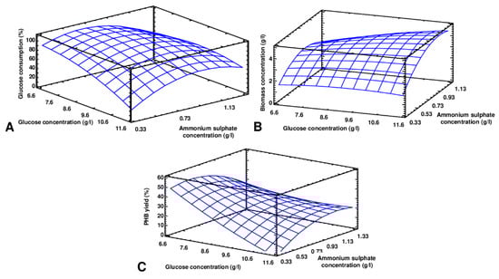 All independent variables had a positive linear effect on glucose consumption and biomass concentration and a negative effect on PHB yield, except for ammonium sulfate concentration, where a statistically significant positive linear effect was observed (p < 0.05). The quadratic effect of all tested effects (AA, BB, CC) had a statistically significant effect on glucose consumption (p < 0.05). At lower ammonium sulfate concentration, glucose consumption was lower (Figure 2A), but PHB production was higher (Figure 2C); conversely, at higher ammonium sulfate concentration, biomass production increased (Figure 2B). Phosphate buffer molarity had a positive linear effect and a negative quadratic effect on biomass production. A negative quadratic effect of this parameter was observed for all variables, moreover, with statistical significance (p < 0.05) for glucose consumption and biomass concentration.