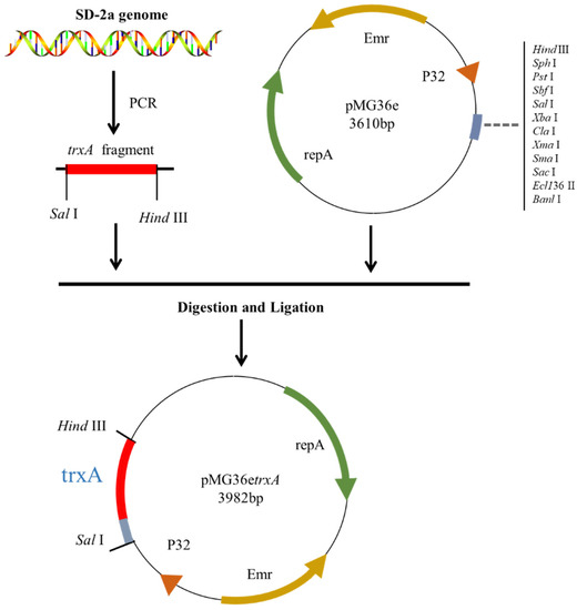 The construction of the expression plasmids is illustrated in Figure 1. The trxA gene was amplified from genomic DNA using primers 5′-GCGTCGACAGAGAAGGAGGAATTATATGGCAAT-3′ and 5′-CCAAGCTTCAGGCTTTTCTTCAATAAAGTATAT-3′; the Hind III and Sal I (underline) were introduced into the amplified gene. The methods of plasmid construction were adopted from reference [12]. The recombinant plasmid was verified by sequencing and named pMG36etrxA; then, it was transformed into L. plantarum WCFS1 by electroporation transformation [12], and these transformants were designated WCFS1-trxA.