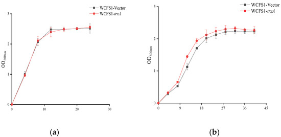 The effects of heterologously expressed trxA on cell growth under acid stress were investigated. As illustrated in Figure 2a, heterologously expressed trxA did not influence the growth of L. plantarum WCFS1 under normal conditions (MRS media with pH 6.3) compared with the control strain WCFS1-Vector. Contrastingly, the heterologous expression of trxA improved cell growth when cells were exposed to acid stress, with a higher maximum OD600 nm value of WCFS1-trxA compared with the WCFS1-Vector (Figure 2b–f). These results demonstrated that the heterologous expression of trxA from O. oeni SD-2a enhances the tolerance of L. plantarum WCFS1 cells under acid stress.