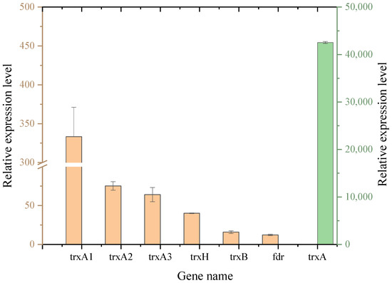 Since the trxA gene often works with other Trx system genes and plays a central role in the Trx system, the expression levels of inherent Trx system genes in WCFS1-trxA and WCFS1-Vector were studied under acid stress (pH 3.6). A former study showed that in the L. plantarum WCFS1 genome, the Trx system had six ORFs: four thioredoxins genes (trxA1, trxA2, trxA3, and trxH), a thioredoxin reductase (trxB), and a ferredoxin NAD (P) reductase (fdr) [19]. This study calculated the expression levels of all the genes in WCFS1-trxA compared with control strain WCFS1-Vector under the same culture conditions. As shown in Figure 3, all Trx system gene expressions were significantly increased. Additionally, the trxA gene increased more than 40,000-fold in WCFS1-trxA compared with WCFS1-Vector, which indicated that the trxA gene derived from O. oeni SD-2a was successfully expressed in WCFS1-trxA, while it had almost no expression in the WCFS1-Vector. The expression levels of fdr, trxB, trxH, trxA3, trxA2, and trxA1 in WCFS1-trxA increased 12.18-, 15.79-, 40.14-, 64.11-, 75.28-, and 333.27-fold compared with those in the WCFS1-Vector, respectively. These results indicated that the heterologous expression of the trxA gene significantly increased the expression level of the inherent thioredoxin system genes in L. plantarum WCFS1 cells, conferring these cells with enhanced resistance to damage caused by acid stress. The heterologous expression of the O. oeni SD-2a trxA gene may affect the activity of the transcription regulator, which activates the transcription of inherent thioredoxin system genes in L. plantarum WCFS1. However, the specific mechanism of this phenomenon needs further study.