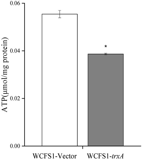 The ATP content in the WCFS1-trxA and WCFS1-Vector cells cultured in MRS medium (pH 3.6). The ATP content is significantly lower in the WCFS1-trxA strain compared with the WCFS1-Vector strain. * means T-test of p value < 0.05.