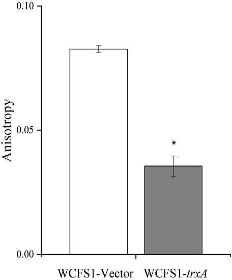The fluorescence anisotropy value of the WCFS1-trxA and WCFS1-Vector cells cultured in an MRS medium (pH 3.6). The fluorescence anisotropy value is significantly lower in the WCFS1-trxA strain compared with the WCFS1-Vector strain. * means T-test of p value < 0.05.