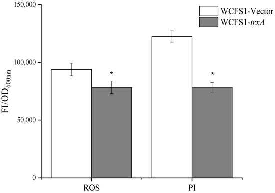 The ROS and PI value of the WCFS1-trxA and WCFS1-Vector cells cultured in an MRS medium (pH 3.6). The ROS and PI values are significantly lower in the WCFS1-trxA strain compared with the WCFS1-Vector strain. * means T-test of p value < 0.05.