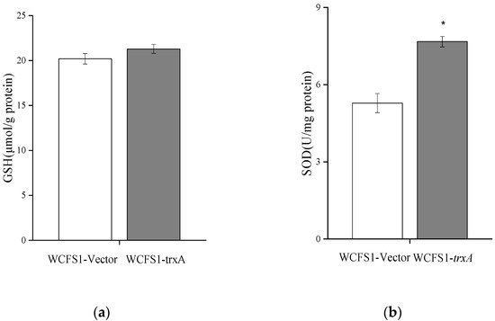 There are two mechanisms (the enzymatic pathway and non-enzymatic pathway) that protect the cells of lactic acid bacteria to reduce the cell damage caused by ROS [19,33]. It can be seen from Figure 6 that the intracellular ROS accumulation of the recombinant strain was lower compared with the control strain. To explore the reasons for the relatively low ROS content in the recombinant strain, the enzymatic factor SOD activity and the non-enzymatic factor intracellular GSH content were determined. SOD is an important antioxidant that can resist the effect of ROS by eliminating superoxides, while GSH is a non-enzymatic antioxidant with functions such as scavenging free radicals, detoxifying, enhancing immunity, and eliminating the stress produced by ROS. As shown in Figure 7, compared with the control strain, the SOD activity of the recombinant strain was significantly higher. SOD is an essential member of the antioxidant enzyme system in cells, which can help the organism resist oxidative damage. Compared with the control strain, the GSH content of the recombinant strain did not have a significant difference. Therefore, the overexpression of the trxA gene mainly removed the accumulated ROS through SOD, thus reducing the oxidative damage caused by acid stress to L. plantarum WCFS1.