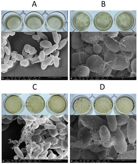 - Hovnanyan, K.; Martuyan, S.; Pepoyan, A.; Navasardyan, L.; Trchounian, A. Transmission and scanning electron microscopy of contacts between bacterial and yeast cells in biofilms on different surfaces. Open Access Libr. J. 2015, 02, 68321. [Google Scholar] [CrossRef]