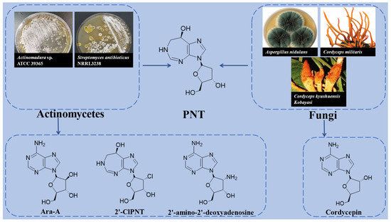 Actinomycetes and fungi are the main resource microorganisms of PNT. PNT was first isolated from the fermentation broth of Streptomyces antibioticus [8]. Purine nucleoside antibiotic 2′-amino-2′-deoxyadenosine was first isolated from the fermentation broth of Actinomadura sp. ATCC 39365 in 1979, and then PNT and 2′-chloropentostatin (2′-ClPNT) also were obtained subsequently [13,21,22]. The biosynthesis gene cluster of PNT and its associated product arabinofuranosyladenine (Ara-A) in Streptomyces antibioticus NRRL3238 was discovered in 2017 [13]. It was firstly reported in 1979 that Aspergillus nidulans could produce cordycepin (COR) and PNT in the meanwhile [15]. Subsequently, it was reported that the Emericella nidulans (the asexual form of Aspergillus nidulans) also could produce PNT [22]. With the development of genome sequencing technologies, some key functional genes in the biosynthesis gene cluster of PNT were discovered based on the genome sequence of the fungi Cordyceps militaris in 2017, and PNT and COR were also obtained in its fermentation broth [12]. By comparing with the PNT biosynthesis gene cluster of Cordyceps militaris, later studies demonstrated that four key genes involved in the biosynthesis of COR and PNT were identified in Cordyceps kyushuensis Kobayasi in 2019 [11]. In summary, the resource microorganisms of PNT and its associated products are shown in Table 1 and Figure 1.