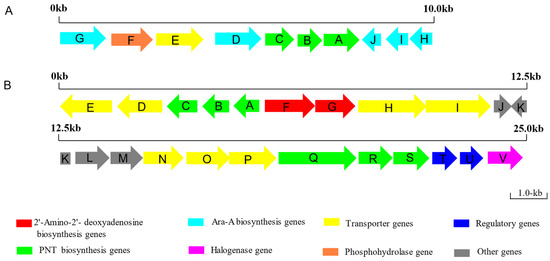 The biosynthesis gene cluster of PNT and associated products in the Streptomyces antibioticus NRRL 3238 and Actinomadura sp. ATCC39365. (A): The biosynthesis gene cluster in Streptomyces antibioticus NRRL 3238. (B): The biosynthesis gene cluster in Actinomadura sp. ATCC39365.