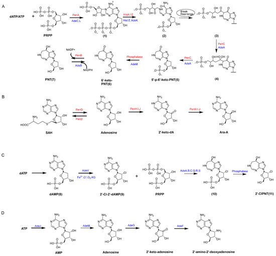 Biosynthesis pathway of PNT and associated products in the Streptomyces antibiotic NRRL 3238 and Actinomadura sp. ATCC39365 (modified from reference [13,14,37]. (A): biosynthesis pathway of PNT in the Streptomyces antibiotic NRRL 3238 and Actinomadura sp. ATCC39365. (B): biosynthesis pathway of Ara-A in the Streptomyces antibiotic NRRL 3238. (C): biosynthesis pathway of 2′-CLPNT in the Actinomadura sp. ATCC39365. (D): biosynthesis pathway of 2′- amino -2′-deoxyadenosine in the Actinomadura sp. ATCC39365. The red fonts indicate the biosynthesis pathway in Streptomyces antibiotic NRRL 3238. The blue fonts indicate the biosynthesis pathway in Actinomadura sp. ATCC39365. The dashed arrows indicate that this step is a speculative process. The solid arrows indicate that this step is a determination process.