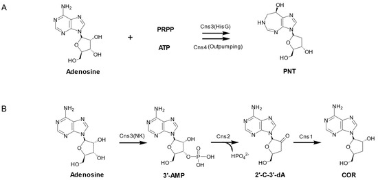 The biosynthesis pathway of PNT has been studied not only in Actinomycetes but also in fungi. It was previously reported that cordycepin and PNT were produced by Aspergillus nidulans, Cordyceps militaris, and Cordyceps kyushuensis Kobayasi [15,22]. To predict the gene cluster of PNT and the associated product COR in Cordyceps militaris, it is assumed that the biosynthesis genes may be conserved between the genomes of Cordyceps militaris and Aspergillus nidulans (Figure 5B), and then four linked genes were identified by genome-wide reciprocity analysis. Then, the four genes in Cordyceps militaris were designated as Cns1, Cns2, Cns3, and Cns4. BLAST analysis indicated that the proteins encoded by these four genes contain different conserved structures, such as the oxidoreductase/dehydrogenase domain in Cns1, the HDc family of metal-dependent phosphohydrolase domain in Cns2, and the N-terminal nucleoside/nucleotide kinase (NK) and C-terminal HisG domains in Cns3. Cns4 is a putative ATP-binding cassette type of transporter (Table 4). This gene cluster contains four genes from Cns1 to Cns4, with a total of 10.3kb (Figure 5A). To determine whether this gene cluster is responsible for cordycepin and PNT biosynthesis, the serial gene deletions and complementation of Cns1–Cns4 in Cordyceps militaris were carried out. To further validate the function of the genes, the heterologous gene expression in Saccharomyces cerevisiae and Metarhizium robertsii were performed. First, the cDNA sequences of Cns1–Cns3 and Cns1–Cns2 were cloned, and then the two gene cluster fragments were transferred into Saccharomyces cerevisiae. The Cns1–Cns3 gene cluster fragment was transferred into Metarhizium robertsii. These results confirmed that Cns1–Cns3 are responsible for COR biosynthesis and the essential roles of Cns1 and Cns2 genes in COR production. In addition, to verify the function of Cns3, the heterologous expression of Cns3 in Metarhizium robertsii and Cordyceps bassiana was employed. It is confirmed that the Cns3 knockout mutant strain could not produce PNT. In addition, they further attempted a partial cDNA sequence, encoding either the NK or the HisG domain of Cns3 to complement the knockout mutant Cordyceps militaris. The results revealed that the complementation with the HisG sequence was able to produce PNT, but the NK domain did not.