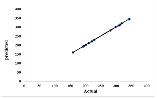 The model terms are significant according to the ANOVA results for the quadratic regression model (p-value < 0.05). Then, the parameters A, B, C, AB, AC, BC, A2, B2, and C2 are all significant. A p-value > 0.100 indicates non-significance. As can be seen, the lack of fit F-value was 5.51, indicating a 6.64% probability for such a high lack of fit F-value to occur under noise. The residual variation can be measured relative to the mean using the coefficient of variation (CV). Typically, a larger CV indicates a lower experiment’s reliability [49]. The coefficient of variation (CV) obtained in this study was 0.40. This demonstrates that the experiment is more reliable. The predicted residual sum of squares (PRESS) can be used to evaluate the goodness of fit. Lower PRESS indicates greater optimal fitness [50]. This study determined a PRESS value of . The calculated coefficient of determination (R2) is 0.9995, which corresponds well with the adjusted R2 value of 0.9999. Figure 1 compares the actual results to the model’s predicted results. As shown in the Figure 1, there is good agreement between the experimental data and the model’s predicted values.