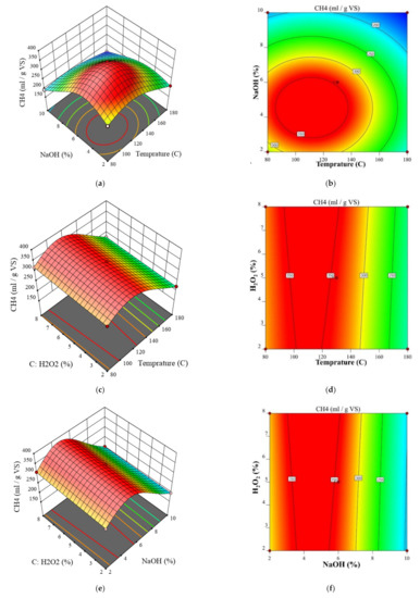 Based on Equation (1), two- and three-dimensional RSM graphs are provided to compare the interaction effect of the variables on the biomethane yield. Biomethane yield is plotted against NaOH concentration and pretreatment temperature in Figure 2a. As observed, the CH4 yield exhibited parabolic relationships with both the NaOH concentration and the temperature. As the NaOH concentration or pretreatment temperature increased, it rose to a certain value and then began to fall. This also applies to Figure 2c,e. It can be stated that the biomethane yield is minimized at an H2O2 content of 5%, NaOH content of 10%, and pretreatment temperature of 180 °C, i.e., 28% lower CH4 yield than the unpretreated sample. Moreover, an increase in H2O2 content increases biomethane production.