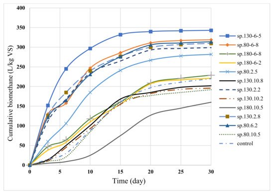 This study utilized Hansen’s method to determine the biogas yield [40]. Additionally, dark glass bottles were used as batch reactors. Before tightening the aluminum bottle cap and plastic lid, various combinations of water (5 mg), microbes, and untreated and treated substrates (based on the dry test material) were added. The microbial mixture and substrate were adjusted to have the same VS. Each bottle underwent 2 min of anaerobic digestion by gaseous N injection. The specimens were examined and subjected to three rounds of microbial fermentation to evaluate biomethane production. In addition, the control sample was utilized under identical conditions for each experiment series. The bottles were kept in an incubator at 37 °C for 30 days, and GC syringe samples were taken every five days to measure biogas production.