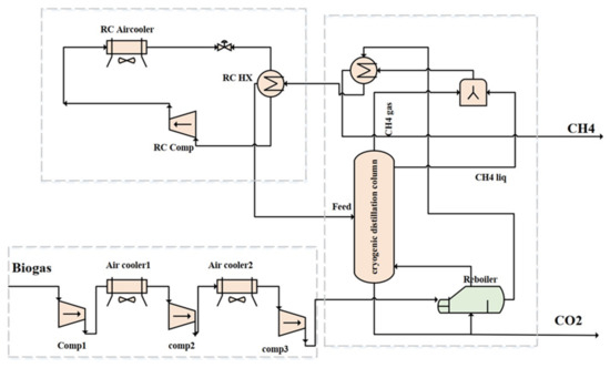 As presented in Figure 5, the biogas enters the distillation column through three intercooler-equipped pressure rise stages (gas coolers). Thus, the hot gas can provide energy to the reboilers, which cools down the gas. In the first case, simulations were performed for unpretreated conditions. The biogas leaves the reboiler at −29.94 °C and approaches a heat exchanger at a minimum of 10 °C. Before entering the distillation column, biogas cools to −71 °C in the refrigeration cycle after leaving the heat exchanger at −37.42 °C. To simulate the refrigeration cycle, R170, R170-R290, and R170-R600 were used as refrigerants. Table 8 provides the equipment’s power consumption.