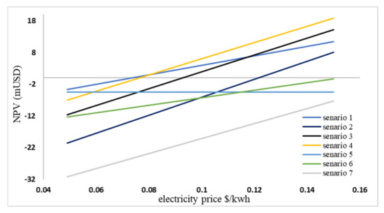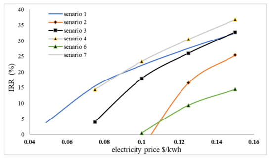 On the one hand, as the selling price of electricity rises, it can be observed that as the scenario’s electricity generation increases, the NPV will increase with a steeper slope. The NPV diagram reveals that scenario 7, with a positive IRR, is not economically viable, even if the price of electricity is tripled. Moreover, with the increase in electricity cost to over 0.09 $/kWh, scenario 4 is valid.