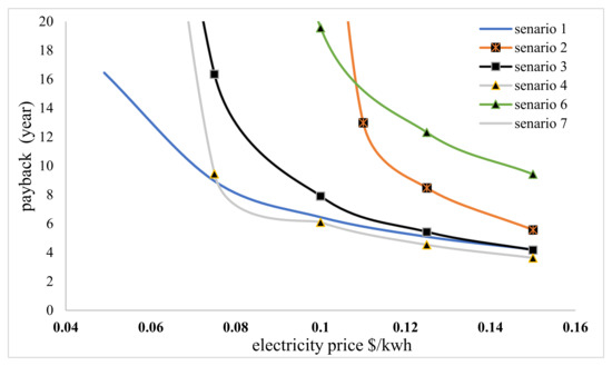 The payback period varies depending on the price of electricity, as shown in Figure 8. Identical outcomes were also observed when analyzing the payback period. The behavior of the scenarios in this diagram is similar to that of the IRR diagram. At the current price of electricity, only scenario 1 is valid, but scenarios 4 and 3 would be more viable with a sequential price increase.