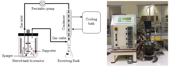A butanol fermentation using immobilized cells was performed in batch mode in a 2 L STR under the optimal immobilization conditions obtained from Section 2.4.3. A gas stripping (GS) system was connected to the STR using the gas from the ABE fermentation (CO2 and H2), as shown in Figure 1. It was started after 24 h of fermentation [41]. A peristaltic pump was used to control the flow rate in the GS at 1 L/min (Watson-Marlow, Falmouth, UK). The temperature of the condenser coolant (Pyrex, Stoke-on-Trent, Staffs, UK; condenser 40 × 450 mm and cooling coil 0.60 × 1500 mm) during the operation was maintained at −8 ± 2 °C using 95% (v/v) ethanol as the coolant [18]. The samples were taken from the STR and receiving flask at regular time intervals for analyses.