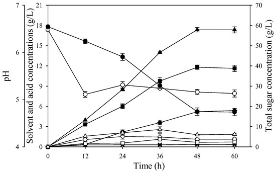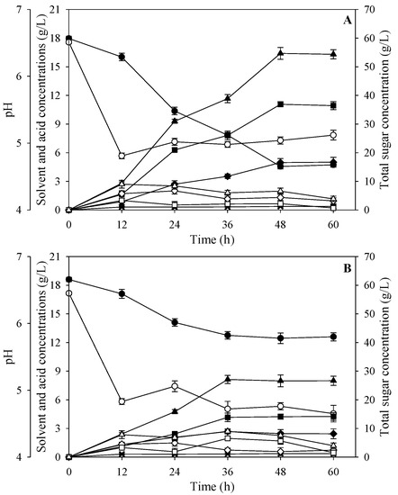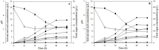 The profiles of the butanol fermentation from a standard synthetic butanol production medium (P2 medium) are shown in Figure 2A. During the fermentation, the pH dramatically decreased in the first 12 h because acetic and butyric acids were formed, implying that acetate kinase and butyrate kinase were respectively active. Additionally, the results suggest that the bacterial cells grew because of the ATP generation from the produced acetic and butyric acids. These phenomena indicate that an acidogenesis phase occurred. Later, the pH slightly increased. Consequently, the solvents (acetone, butanol, and ethanol) were clearly detected in a solventogenesis phase. These results suggest that the acetoacetate decarboxylase, butanol dehydrogenase, and alcohol dehydrogenase were respectively active [43]. In this phase, a PB value of 11.06 g/L was achieved after 48 h of fermentation, whereas the acetone and ethanol concentrations were 4.96 and 0.37 g/L, respectively (Table 4). Under these conditions, the PABE value was 16.40 g/L, whereas a YB/S of 0.25 g/g and QB of 0.23 g/L·h were obtained. At the end of the fermentation, the total sugar concentration remaining in the broth was ~15 g/L. Complete sugar consumption did not occur, which might have been due to butanol toxicity [14]. Zhang et al. [44] reported that more than 7.4 g/L of butanol could inhibit the growth of wild-type C. beijerinckii. Additionally, Cheng et al. [45] reported that fermentations with Clostridium suffer from a low butanol concentration (<1.5 wt%) and productivity (<0.5 g/L·h) because of the high butanol cytotoxicity. However, this depends on the bacterial species and environmental conditions used during the fermentation.