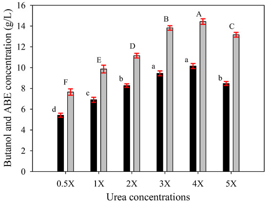 Butanol (black bars) and ABE (gray bars) contents of butanol fermentation from SSJ medium supplemented with various urea concentrations by free cells (1X = 0.16 g/L of urea) at the fermentation time of 48 h. The error bars represent the standard deviation of the mean values. Bars associated with the same letter have no significant differences assessed by Duncan’s multiple range test with a critical value of 0.05.