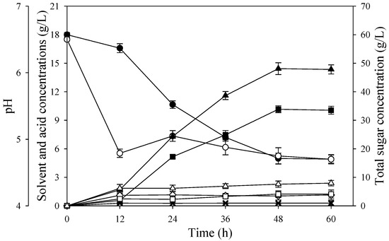 - Li, H.-G.; Zhang, Q.-H.; Yu, X.-B.; Wei, L.; Wang, Q. Enhancement of butanol production in Clostridium acetobutylicum SE25 through accelerating phase shift by different phases pH regulation from cassava flour. Bioresour. Technol. 2016, 201, 148–155. [Google Scholar] [CrossRef]