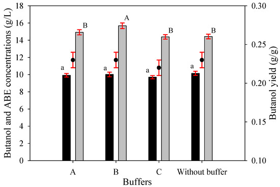 Butanol concentration (black bars), ABE concentration (gray bars), and butanol yield (black dots) values of butanol fermentations from SSJ medium containing 0.64 g/L urea and various buffers with C. beijerinckii TISTR 1461 at 48 h. Buffer A: KH2PO4, K2HPO4, and ammonium acetate; buffer B: KH2PO4 and K2HPO4; buffer C: ammonium acetate and no buffer. The error bars represent the standard deviation of the mean values. Bars associated with the same letter have no significant differences assessed by Duncan’s multiple range test with a critical value of 0.05.