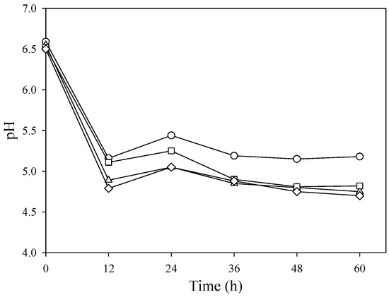 The pH profiles during butanol fermentations from SSJ medium containing 0.64 g/L of urea and various buffers with C. beijerinckii TISTR 1461. Buffer A (○): KH2PO4, K2HPO4, and ammonium acetate; buffer B (□): KH2PO4 and K2HPO4; buffer C (∆): ammonium acetate; no buffer (◊).