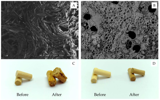Scanning electron microscope (SEM) images of cigarette filter tips (A) and bamboo chopsticks (B) at 100× magnification, as well as the physical characteristics of the cigarette filter tips (C) and bamboo chopstick pieces (D) before and after butanol fermentation in SSJ medium.