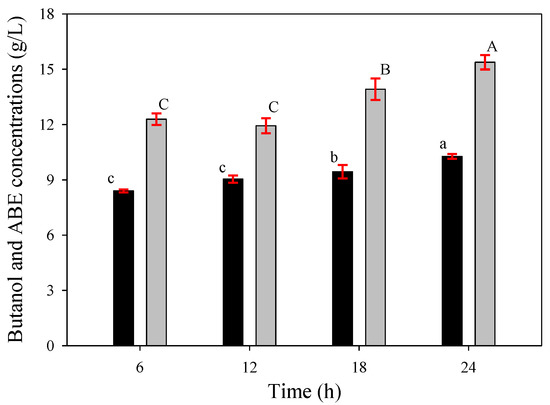 When the times for cell immobilization on bamboo chopstick pieces before fermentation varied from 6 to 12, 18, and 24 h, it was found that the butanol production efficiency significantly increased (p < 0.05) with the immobilization time from 6 to 24 h (Figure 9). This might have been due to the increased number of Clostridium cells immobilized on the carriers, as well as the growth. An immobilization time of 24 h gave the highest PB (10.27 g/L), PABE (15.38 g/L), and sugar consumption (73.84%) values (Table 8). Therefore, an immobilization time of 24 h was used in the subsequent experiments.