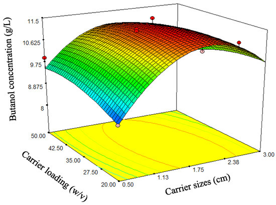 Three-dimensional response surface plots for butanol production—effects of the carrier size and carrier loading.
