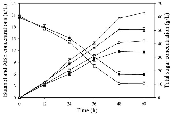 Batch butanol fermentations from SSJ medium with immobilized C. beijerinckii TISTR 1461 with (○, □, ∆) and without (●, ■, ▲) a gas stripping system: total sugar (○, ●), butanol (□, ■) and ABE (∆, ▲) concentrations.