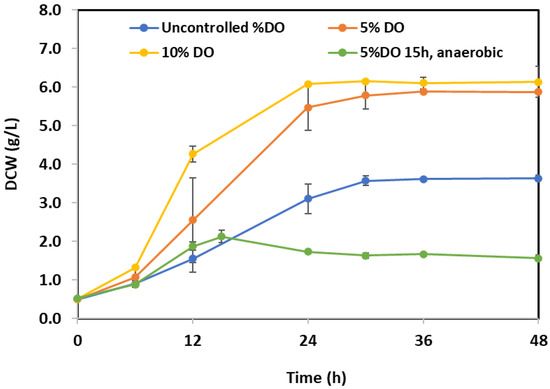 The impact of four DO control strategies on B. subtilis GD5 cell growth and 2,3-BD production was investigated in a 2-L bioreactor operated under batch mode (Figure 1). Unless stated otherwise, the fermentations were carried out at 30 °C, pH 6.0 and an aeration rate of 1.0 vvm throughout the cultivation. Higher growth levels were obtained when DO concentrations were maintained at 5 and 10% with cascade agitation throughout the fermentation, compared to fermentations with uncontrolled DO. This indicated that higher stirrer speed generated higher oxygen saturation and provided better mixing of bacteria and medium in the bioreactor, stimulatin bacterial growth. It is noted that B. subtilis entered the exponential growth phase after 6 h and maximum DCW (5–6 g/L) was reached within 24 h in both DO control levels. In uncontrolled DO fermentations, cell growth increased gradually up until 30 h. In the case of the two-stage DO control strategy, higher growth (maximum DCW 2.1 g/L) was observed during the first stage with cascade agitation at 5% until 15 h. However, during anaerobic conditions (after 15 h), bacterial growth decreased slightly, possibly due to the absence of dissolved oxygen in the medium. In terms of maximum specific growth rate (µmax), the highest µmax of 0.37 h−1 was achieved in the runs with controlling DO at 10% followed by a µmax of 0.23 h−1 when controlling DO at 5%, whereas µmax values of 0.14 and 0.16 h−1 were obtained in cultures with uncontrolled %DO and the two-stage DO control regimes, respectively.