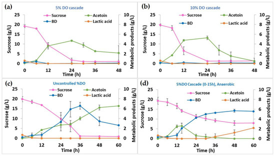 Time courses of substrate utilisation and production of metabolic products by B. subtilis from sucrose-based medium in 2 L bioreactor at 30 °C pH 6, aeration rate 1.0 vvm under (a) controlling DO with cascade agitation at 5%, (b) controlling DO with cascade agitation at 10%, (c) uncontrolled DO at fixed stirrer speed at 180 rpm throughout fermentation, (d) controlling DO with cascade agitation at 5% during the first 15 h, followed by anaerobic conditions.