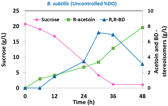 To further understand the mechanism of ACR/BDH enzymes involved in the metabolic pathway of 2,3-BD production, the isomers of the produced acetoin and 2,3-BD were identified. R-acetoin is produced under anaerobic conditions from acetolactate, whilst S-acetoin is the product of aerobic fermentations from diacetyl. The existence of various ACR/BDHs in native 2,3-BD producers leads to different 2,3-BD isomers [54]. Interestingly, B. subtilis produced high optical purity of R- acetoin (100%) and (R,R)-2,3-BD (100%) throughout the cultivation under uncontrolled DO regime (Figure 3). This could imply that the limited presence of oxygen promoted the (R,R)-ACR enzyme that catalyses the conversion of R-acetoin to (R,R)-2,3-BD during the exponential growth phase. On the contrary, during the late stationary phase and after sugar depletion, (R,R)-BDH seemed to be active and converted (R,R)-2,3-BD to R-acetoin. This is the first study that reports on optically pure (~100% purity) R-acetoin and (R,R)-2,3-BD isomers produced by the non-pathogenic wild-type strain B. subtilis DG5. This finding was consistent with the work of Fu et al. [55] who revealed that the wild-type B. subtilis 168 generated only (R,R)-2,3-butanediol (purity > 99%) under low oxygen conditions [55]. Most studies in the literature have reported that wild-type strains of B. subtilis produce a mixture of (R,R) and meso-2,3-BD with a ratio of 3:2 [1,2,56,57,58]. Optically active forms of 2,3-BD are industrially important as chiral groups for the production of high-value chemicals and pharmaceutical products [59].