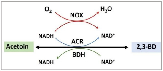 As one pair of cofactors, NADH and NAD+ play a vital role in more than 300 biochemical reactions including oxidation and reduction [60,61], which help maintain a constant redox state for microbial cell metabolism [62]. The 2,3-BD pathway participates in the regulation of NAD+/NADH ratio in bacterial cells. As shown in Figure 4, acetoin can be converted into 2,3-BD by acetoin reductase (ACR) with the concomitant oxidation of NADH to NAD+. Thus, the biosynthesis of 2,3-BD is likely driven by the proportion of a rate-limiting factor, particularly ACR activity, and/or NADH levels [24]. During the catalytic reaction of butanediol dehydrogenase (BDH), 2,3-BD is reversibly transformed to acetoin concomitantly with the reduction of NAD+ to NADH. Consequently, NAD+ is depleted, whilst NADH and acetoin are produced [53]. Thus, a driving force carried out by NADH oxidase (NOX) is required to regenerate NAD+ from NADH to maintain a constant redox state in the bacterial cell. NOX reduces oxygen to produce either water or hydrogen peroxide [63].