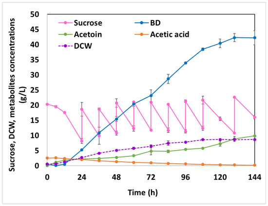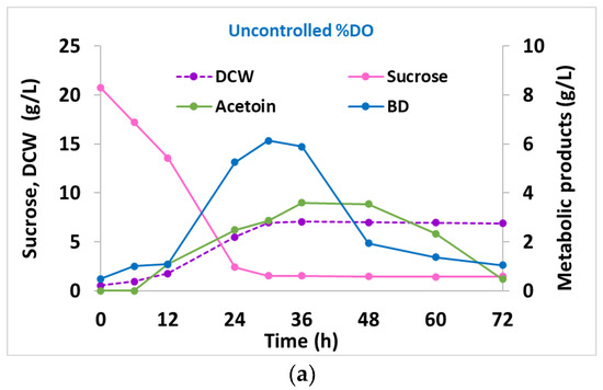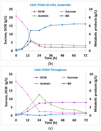 Additionally, the effect of different DO control strategies on 2,3-BD and acetoin production was evaluated. Controlling the DO at 5 or 10% contributed to the high oxygen concentration in the bioreactor, and resulted in the accumulation of acetoin (approximately 5 g/L), whereas very low levels of 2,3-BD (≤1 g/L) were obtained. This finding is in agreement with the study of Qureshi et al. who reported that excessive aeration-agitation led to the production of acetoin at the expense of 2,3-BD [42]. Moreover, after sucrose was depleted, acetoin concentration decreased to nearly zero (Figure 2a,b). This phenomenon was in agreement with Xiao [43] who claimed that acetoin could be reutilised during the stationary phase after the depletion of other carbon sources, providing further evidence that microorganisms produce 2,3-BD and acetoin as carbon and energy storage [43,44].