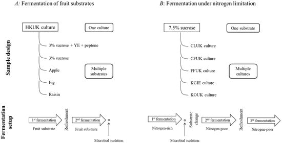 Experimental design. (A) Fermentation of fruit substrates. (B) Fermentation under nitrogen limitation.