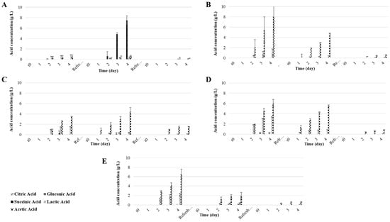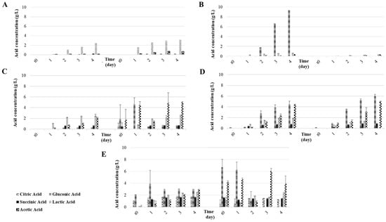 Organic acid development in fruit water kefirs. (A) Sucrose, yeast extract and peptone, (B) sucrose, (C) apple, (D) raisin, (E) fig.