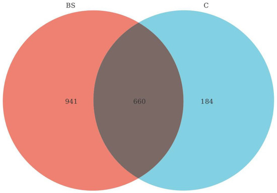 The Venn diagram (Figure 2) revealed significant differences in the OTUs between the C group and the BS group. The two groups shared 660 OTUs, but the C group had 184, whilst the BS group had 862 unique OTUs, respectively.