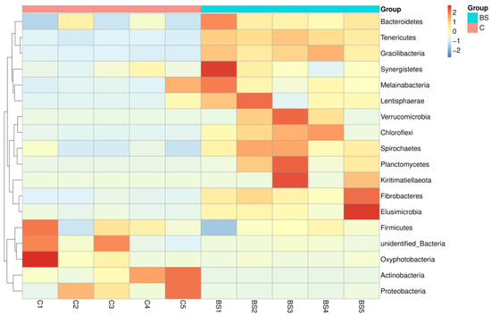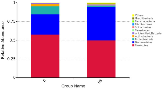 At the phylum level, the abundances of Firmicutes, Actinobacteria, Oxyphotobacteria, and Proteobacteria in the BS group were significantly lower than the C group (p < 0.05), whereas the abundances of Bacteroidetes and Tenericutes were higher (p < 0.05) for the BS group than for the C group of sheep. Other taxonomies less than 1% and those not annotated only accounted for 1.6% and 2.2% for the C and BS groups, respectively (Table 1 and Table 4). The heat map of the phylum-level classification also showed the same trend (Figure 3). Firmicutes and Bacteroidetes were the most abundant phylum in both group of sheep, although the abundance of microorganisms in each phylum varied between the two groups (Figure 4). The total abundances of Firmicutes and Bacteroidetes were 94.9% in the BS group and 84.6% in the C group. Interestingly, the Firmicutes/Bacteroidetes (F/B) ratios were 1.11 and 2.14 for the BS and C groups, respectively.