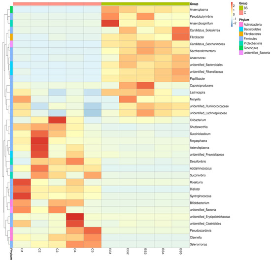 At the genus level, the abundances of unidentified Lachnospiraceae, Rikenellaceae and Bacteroidales, and Saccharofermentans were higher (p < 0.05), but the abundances of Succiniclasticum, Succinivibrio, Dialister, Syntrophococcus, and Shuttleworthia were lower (p < 0.05) in the rumen fluid of the BS lambs than that of the C group lambs. The abundances of Ruminococcaceae, Pseudoscardovia, Roseburia, Selenomonas, and unidentified Prevotellaceae and Clostridiales were similar between the two groups (Table 1 and Table 5). The taxonomy accounting for less than 1% of the abundance with no annotation was higher (p < 0.05) for the BS than for the C group of lambs. The heat map of the genus-level classification also showed the same trend (Figure 5).