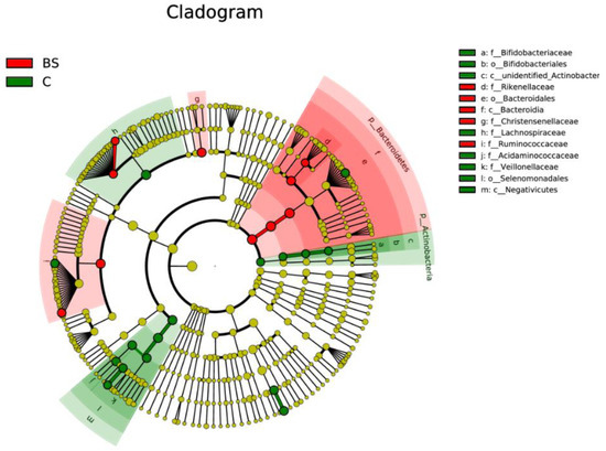 The evolutionary cladogram revealed that the species playing an important role were Rikenellaceae, Bacteroidales, Bacteroidia, Bacteroidetes, Christensenellaceae, and Ruminococcaceae in the BS group, whereas these were Bifidobacteriaceae, Bifidobacteriales, Actinobacter, Acidaminococcaceae, Veillonellaceae, Selenomonadales, Negativicutes, and Lachnospiraceae for the C group (Figure 6). The other taxonomies that accounted for less than 1% in both groups were excluded.