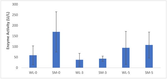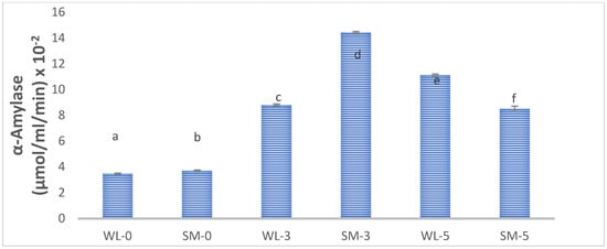 α-Amylase activities in fermented leaves of S. monostachyus. Results = mean ± sd (n = 3). a–f The results with different superscript alphabets are significantly different (p < 0.05). Keys: SM = S. monostachyus; WL = water leaf (T. fruticosum).