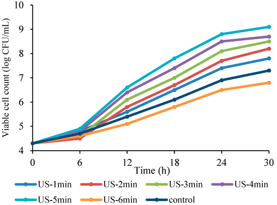 The effect of US on L. reuteri growth of in Bakraei juice during 30 h fermentation is depicted in Figure 1. As can be seen in the figure, the initial number of L. reuteri (4.3 CFU/mL) was significantly (p < 0.05) increased in both US-treated and control samples with the elapse of fermentation period. The highest cell counts were observed in the US-5 min treatment, followed by 4, 3, 2, and 1 min compared to the non-sonicated juice. In contrast, the US time increase up to 6 min negatively affected the bacterial growth and decreased the microbial population compared to the non-sonicated juice. The highest and lowest viable cell counts were observed in US-5 min (9.1 CFU/mL) and US-6 min (6.8 CFU/mL) treatments, respectively, compared to the control sample (7.3 CFU/mL). It is clear from the data that the bacterial population is mainly dependent on the duration of US treatment, in which short-term sonication (1-5 min) induced growth stimulation, while long-term treatment (6 min) induced growth inhibition compared to the control sample. These findings concur with the results of Hashemi et al. [5], who observed a growth intensification of Lactobacillus helveticus and Lactobacillus acidophilus after 10 and 20 min US treatment and a decreased cell viability after 30 min US treatment during date syrup fermentation. Growth stimulation under the influence of US can be attributed to the increase in the membrane permeability and the transfer rate of materials due to pore formation. For instance, US has the potential to create pores in the cell membrane and to form microcurrents inside the cell, promoting molecules transport from the boundary layers [3,32]. The effect of US on milk fermentation was previously investigated, observing the authors that some components were released from the ruptured cells that stimulated the growth of lactobacilli [33]. In contrast, the inhibition impact of US on microbial proliferation and cell viability has been reported by several studies [34,35,36]. Mechanical destruction of cells is the main reason for the inhibition impact of US on microbial cells. It is known that cavitation and mechanical impact caused by extreme pressure difference lead to the destruction of microbial cell wall [37]. In addition, the microbial inactivation by US is also related to the sonochemical effect. The very high temperature and pressure resulting from the collapse of microbubbles leads to the production of free radicals, causing oxidative damage [38].