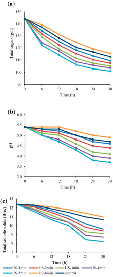The impact of US on pH, total soluble solids and total sugars of Bakraei juice during the fermentation process are presented in Figure 2. According to the Figure 2a, the content of total sugars notably (p < 0.05) decreased in all sonicated and unsonicated samples during 30 h of fermentation. The application of US in the fermentation process led to an increase in sugar consumption, while this increase was dependent on the duration of the US treatment. The initial amount of total sugars (144.4 g/L) reached 100.9 g/L and 115.4 g/L, in the treatments of US-5 min and US-6 min, respectively, compared to the unsonicated juice (112.7 g/L), at the end of the fermentation period. Generally, sugar is the main source of carbon and energy involved in the growth of microorganisms [39]. The greater reduction in total sugars in US-5 min treatment compared to the control sample indicates the greater growth of L. reuteri and the greater consumption of sugar during the fermentation process, which confirms the results of Figure 1. Similarly, US technology enhanced the carbohydrate metabolism in apple juice during fermentation by Lactobacillus plantarum [3]. Furthermore, an increase in lactose hydrolysis as a result of increasing the duration of US treatment from 5 min to 15 min was observed in fermented milk containing L. plantarum [40].